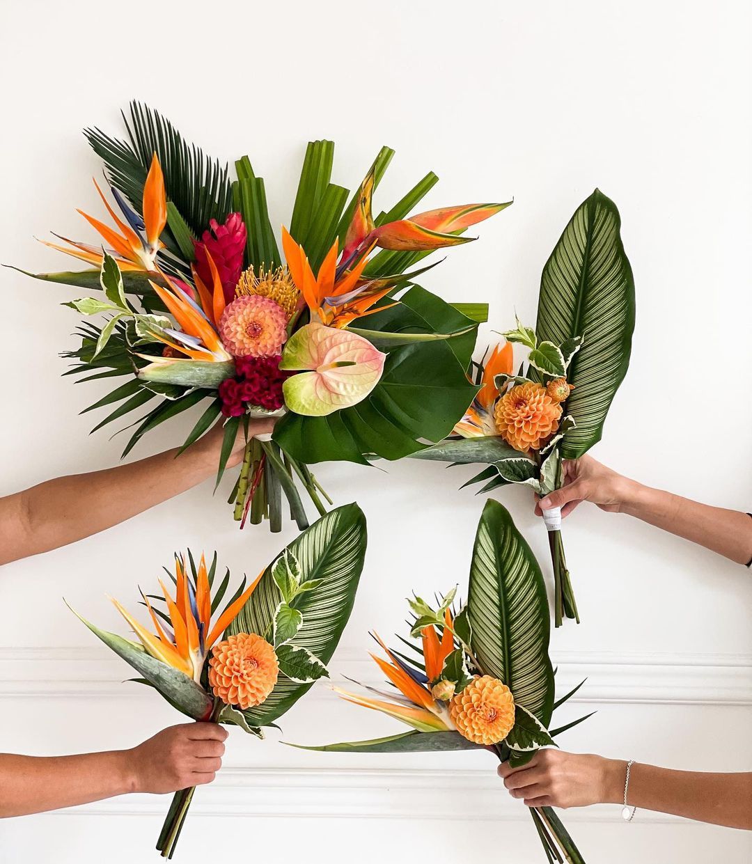 Combined with local or resilient flowers such as orchids and heliconias, these bouquets create a stunning and organic visual impact.